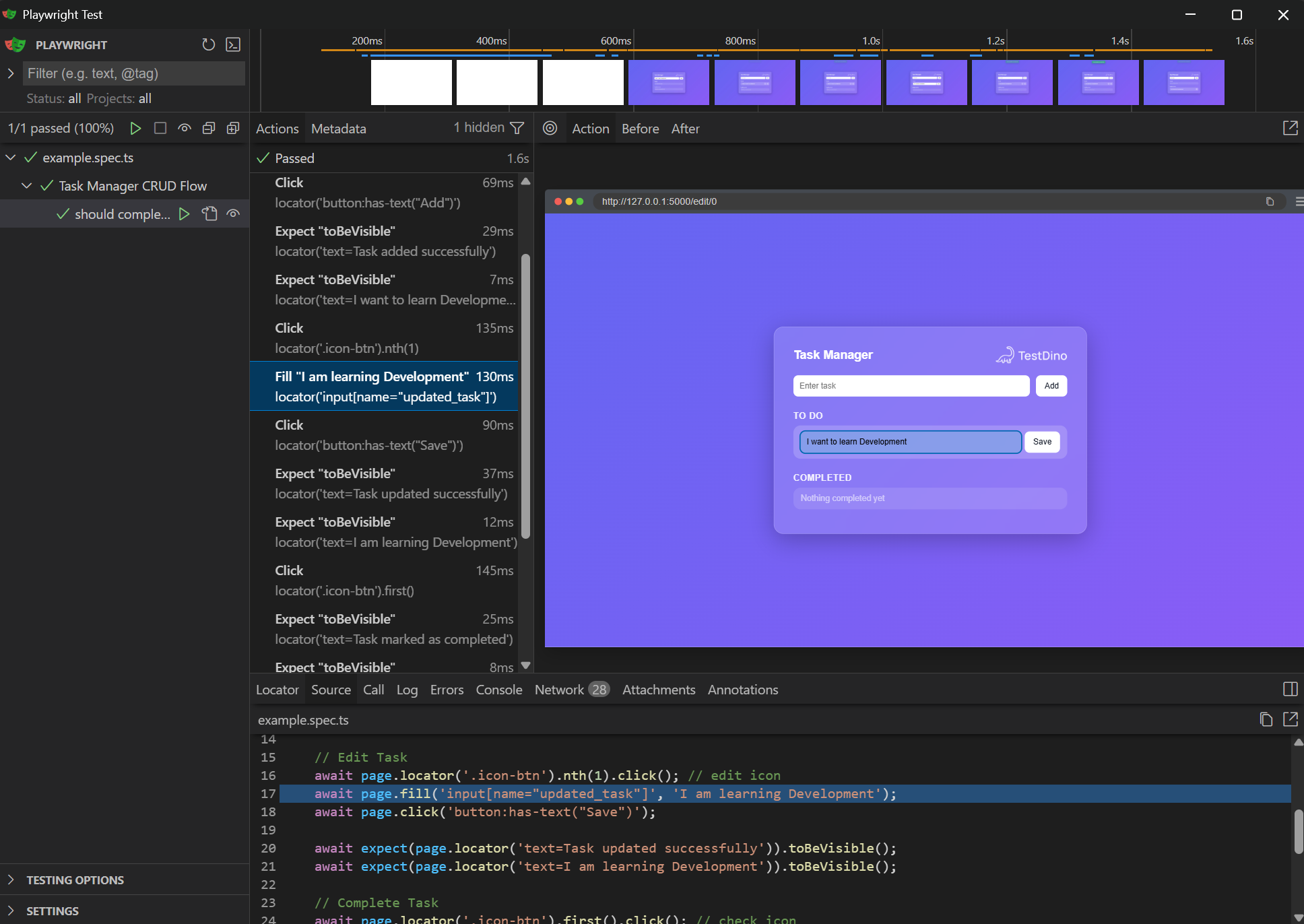 Second, the webServer block tells Playwright to start your Flask app automatically before running tests. When tests finish, the server shuts down. You don't need two terminals or manual server management.