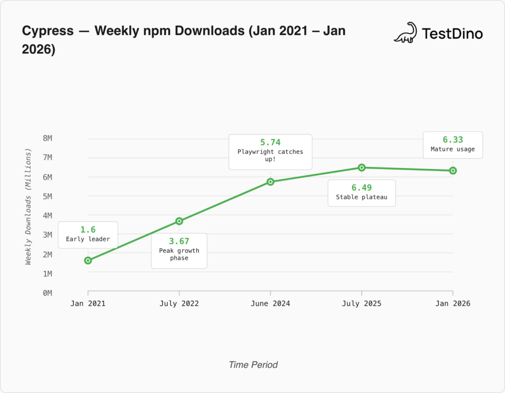 npm data from 2023 through early 2026 shows Cypress holding steady between roughly 5 and 6.5 million weekly downloads. That's not a decline. But in a market where Playwright grew by multiples during the same period, standing still is falling behind in relative terms.