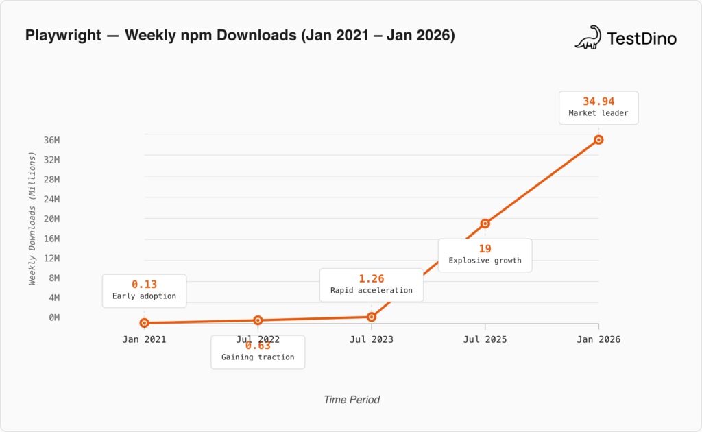 2025-2026: Clear Market Leader. npm data from late 2025 through early 2026 shows the playwright package fluctuating between 20-33 million weekly downloads depending on the snapshot date. TestDino's own Playwright market share analysis documented adoption across 424,000+ GitHub repositories and 4,484 verified companies, including Fortune 500 firms like Amazon, Walmart, Apple, NVIDIA, and Microsoft.