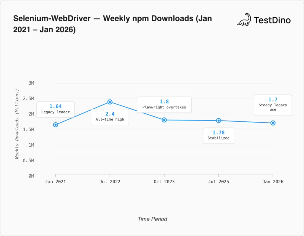 Selenium's npm story looks like a decline: from a peak of roughly 2 million selenium-webdriver downloads per week in 2022 to around 1.7 million in early 2026. But this is one of the most misleading metrics in the testing space.